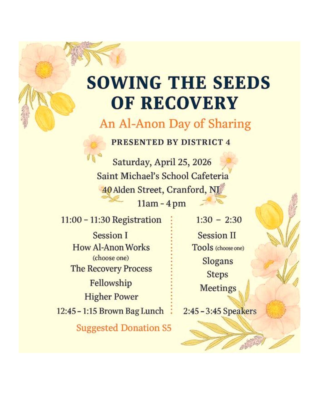 All are invited to District 4 Day of Sharing Theme - Sowing the Seeds of Recovery Enjoy Two Sessions, Speakers, and Fellowship Please see flyer for more information