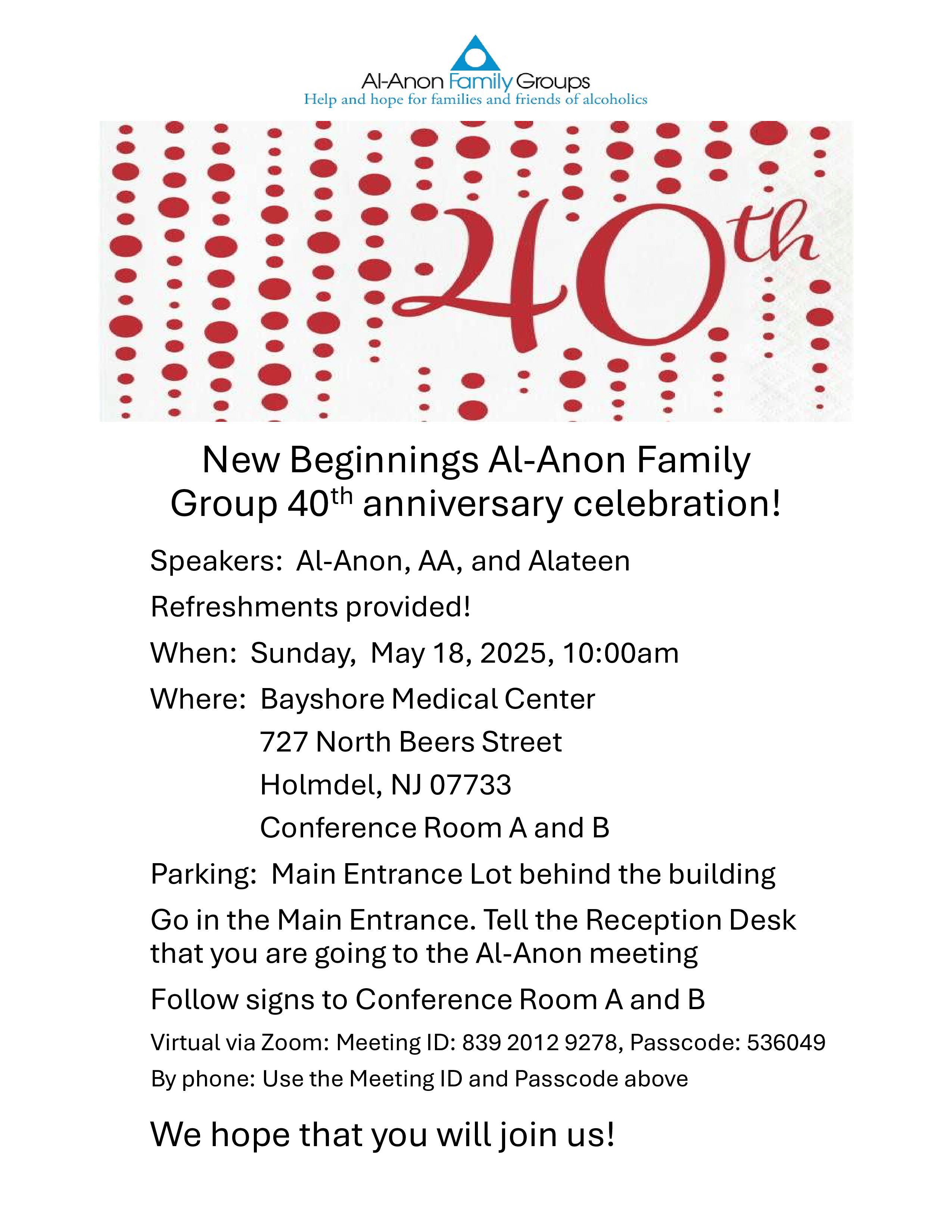 Celebrating 40 Years! Speakers - Al-Anon, AA, and Alateen Refreshments provided Meeting in person and on Zoom Bayshore Medical Center Zoom - Meeting Id: 839 2012 9278 Passcode: 536049 See […]