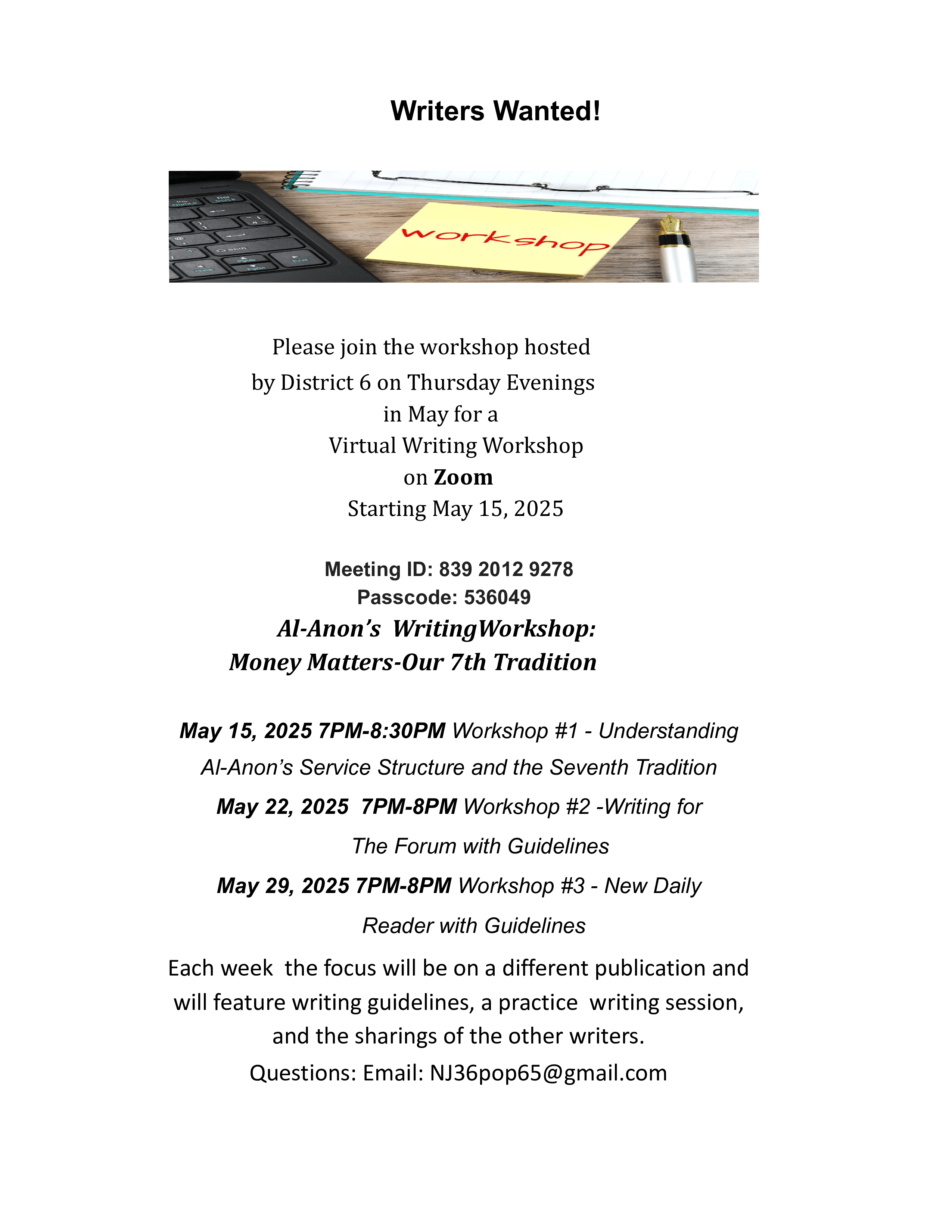 Workshop - Understanding Al-Anon's Service Structure and 7th Tradition Writers Wanted! Workshop will feature writing guidelines, a practice writing session, and the sharings of other writers. Meeting ID: 839 2012 […] |